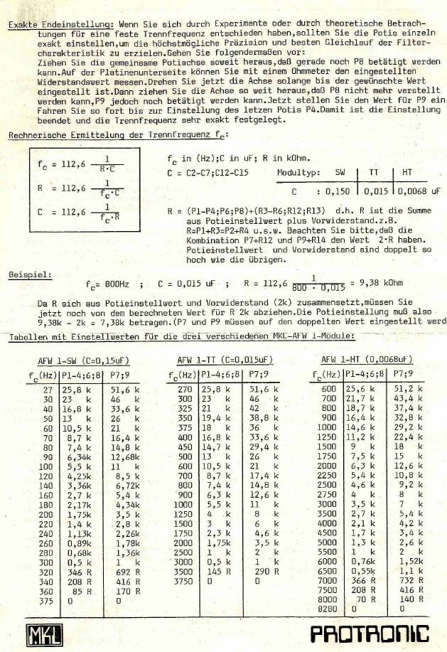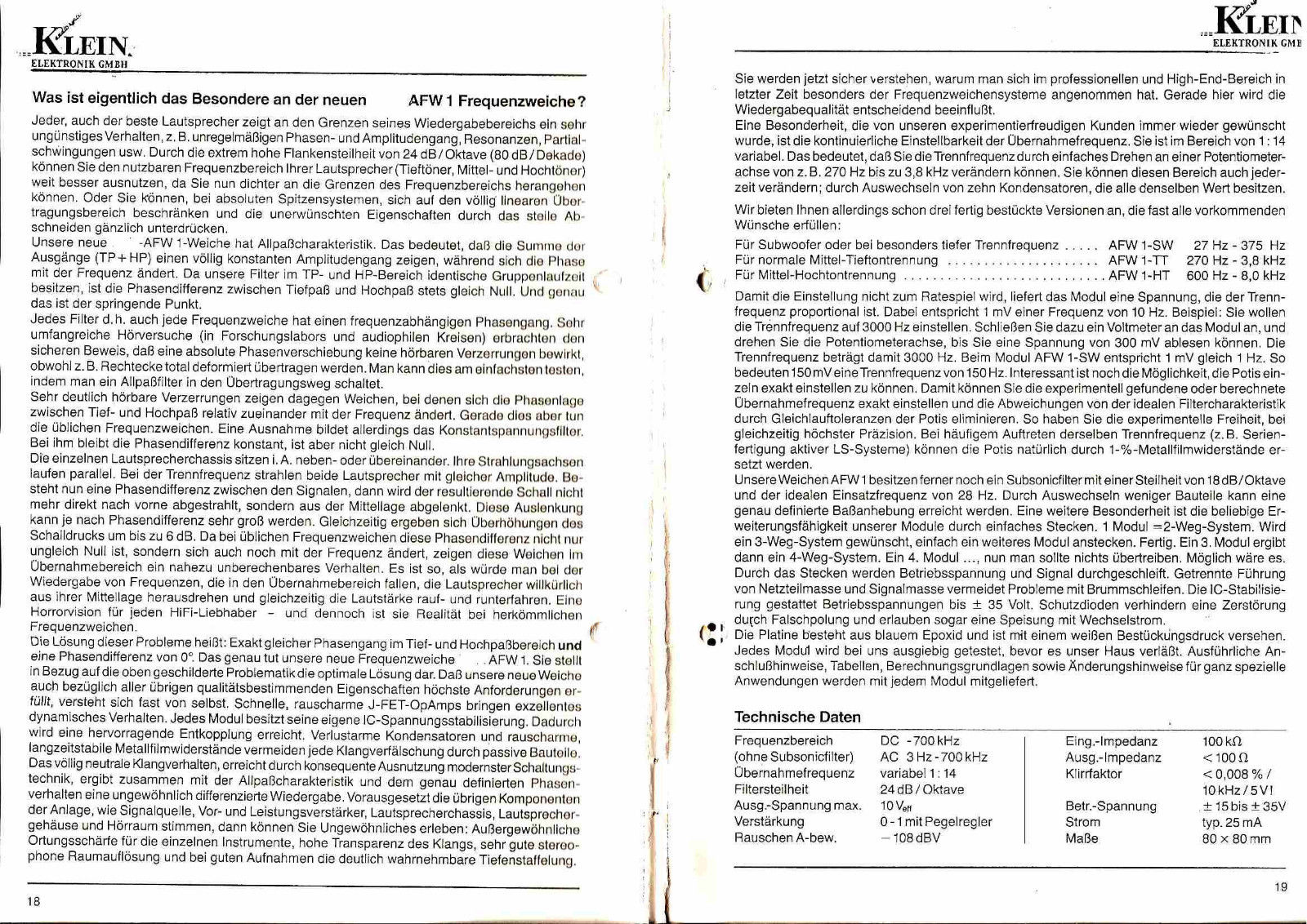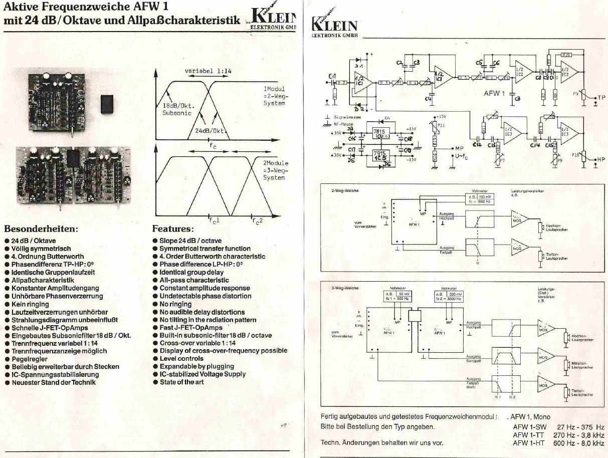 HKlein (MKL) AFW1 4-Weg 24dB/Oktave Aktivweiche mit Linkwitz/Riley Characteristik, mit voll variablen Trennfrequenzen 400-2000-6500 als Allpaß. Pegeleinstellung für jeden der acht Ausgänge zum Abgleich. Früher mittels selbstgebauten ELO NF Millivoltmeter, heute Nakamichi T100 mit Messmikrofon.