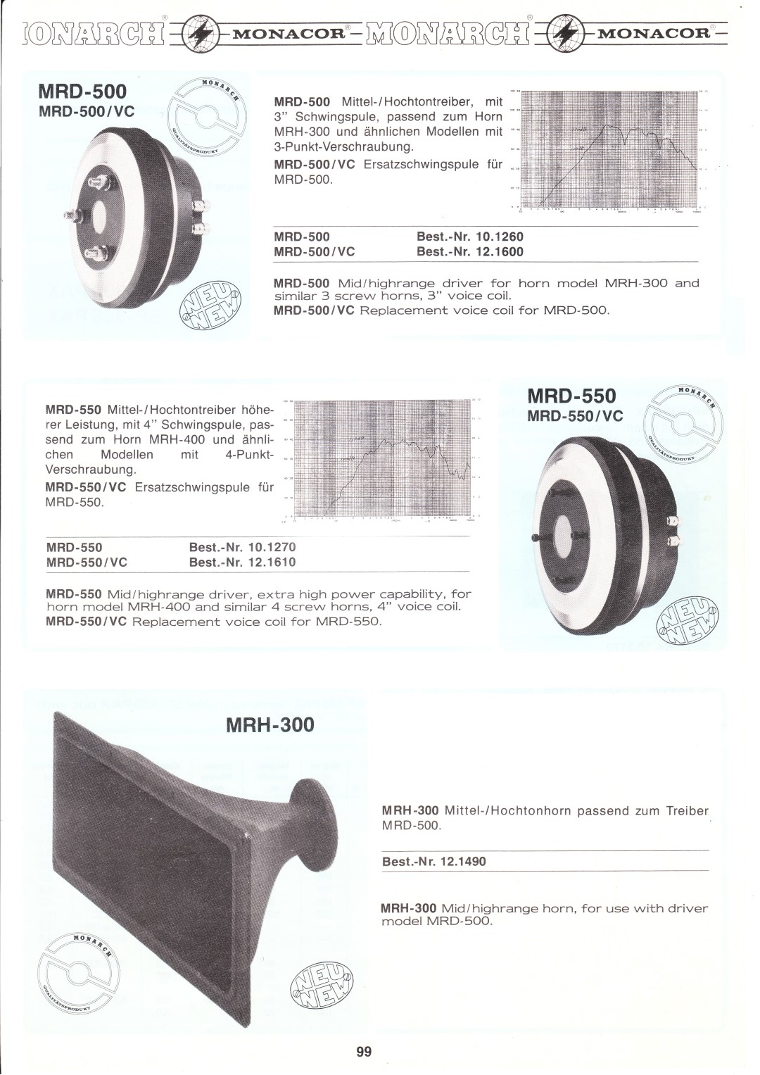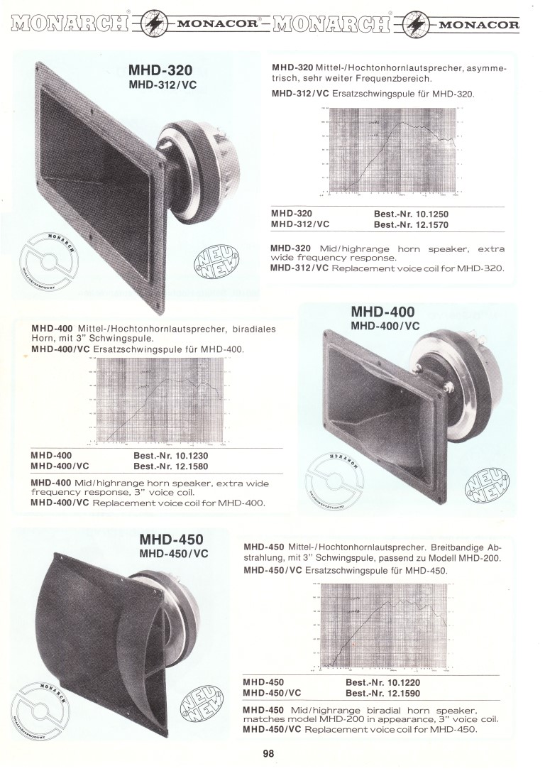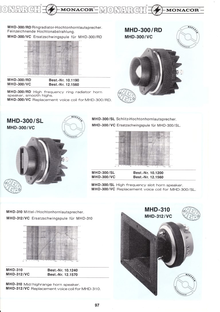 MT: Exponential Aluhorn Monarch MRH400 400Hz-2Khz in Lotsandkammer, Rückwärtig offen an einen akustischen Sumpf im Basskanal angekoppelt, 2“ Monarch MRD550, 108dB/Watt/m mit 4" (100mm) Titan-Membran, 11,2Kg.