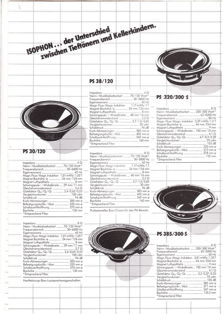 TMT: Isophon PS385/300S, 105dB/Watt/m als Direktstrahler 180-400Hz, 1,35Tesla, 85Mmg, 12,8Kg, Chassis mit 10cm fester Steinwoll-Korbdämpfung gegen Druckkammerreflexionen